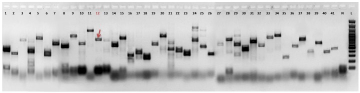 Red arrow indicates PCR product of retrogene in pooled cDNA from 16 human tissues (Clontech). Red number of lane indicates particular retrogene; L - GeneRuler 100 bp DNA Ladder (Thermo Fisher Scientific); N - No template control (water instead of cDNA)