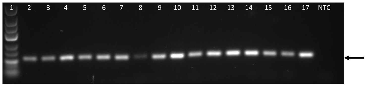 Additional comment: Black arrows indicate PCR products of retrogenes undergoing deletions in various human populations (A-J). Lane 1 –GeneRuler Low Range DNA Ladder (Thermo Scientific); 2 –Heart; 3 –Brain; 4 –Placenta; 5 –Lung; 6 –Liver; 7 –Skeletal Muscle; 8 –Kidney; 9 –Pancreas; 10 –Spleen; 11 –Thymus; 12 –Prostate; 13 –Testis; 14 –Ovary, 15 –Small intestine 16 –Colon; 17 –Leukocyte; NTC—No template control (water instead of cDNA).