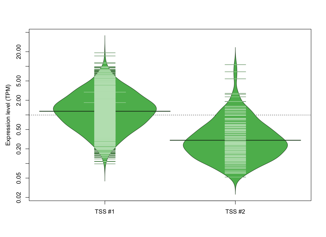 TSS expression levels were studied across 1829 TSS-CAGE libraries, based on FANTOM5 data.